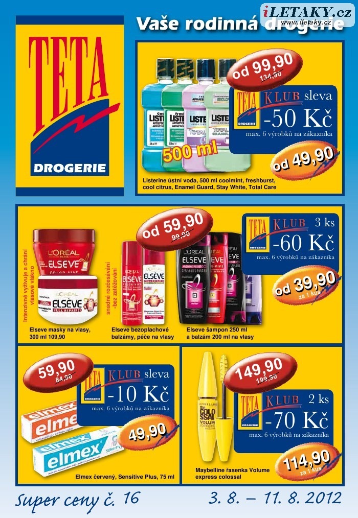 Prohlédněte si leták TETA drogerie s platností 03.08. - 11.08.2012. Na online-letaky.cz naleznete všechny letáky Teta drogerie i letáky dalších drogerií.